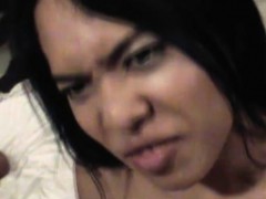 Cute asian ladyboy in lingerie tugging on her cock in bed