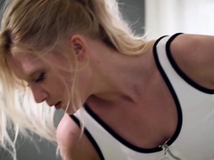Skinny blonde with glasses pleases her tight peach with a p