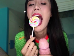 Slim ladyboy with big boobs gives her boyfriend a blowjob